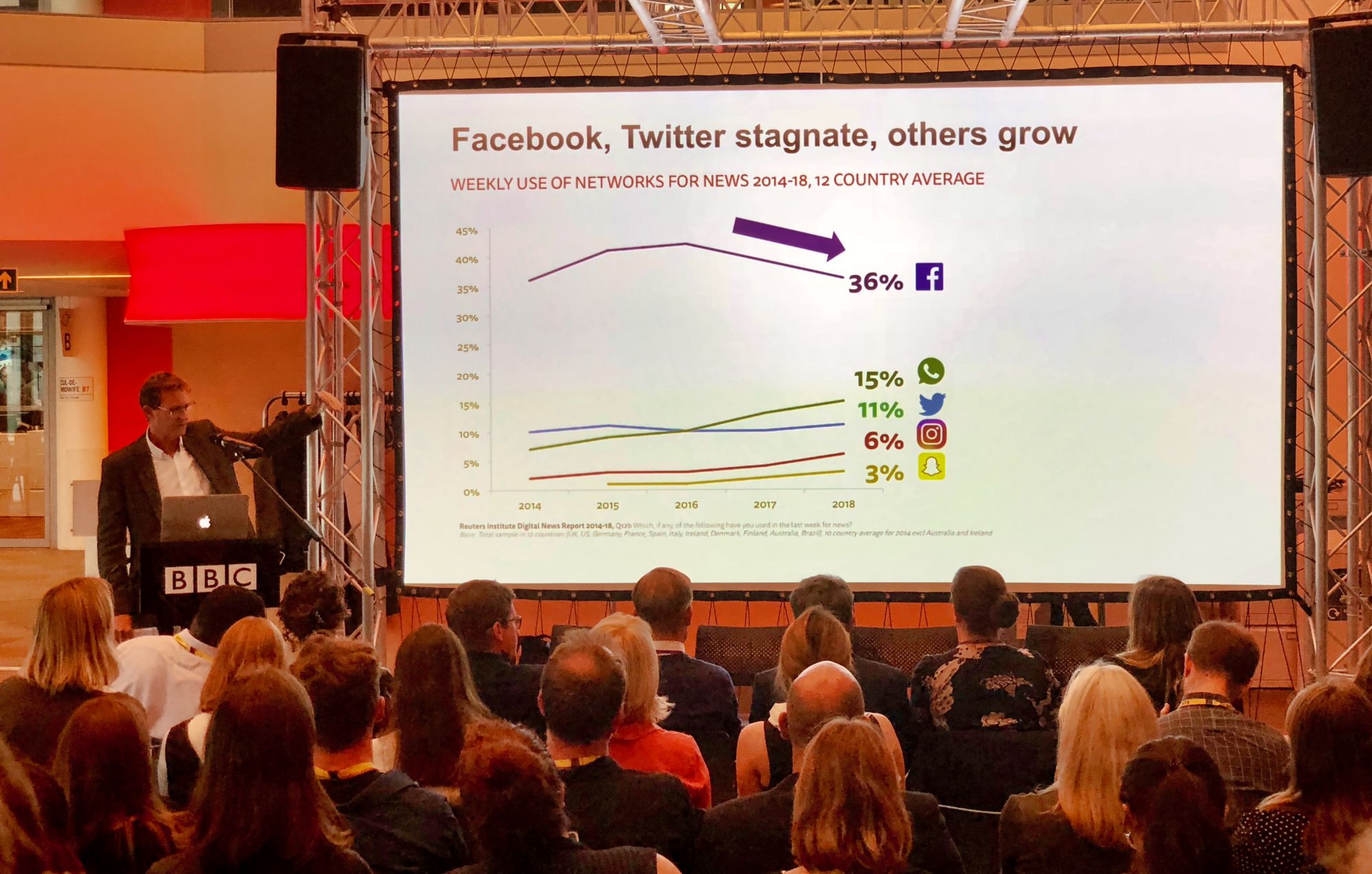 After a welcome from Mark Frankel, the social media editor at our host for the evening, the BBC, Nic Newman from the kicked off the main part of the session by setting some context - most notably the decline in Facebook as a source of news for many people — even if it still remains the biggest single source for many publications — with chat apps rising to replace some of what had been lost. What is driving this change? That's what Jason Vir's research set out to answer.