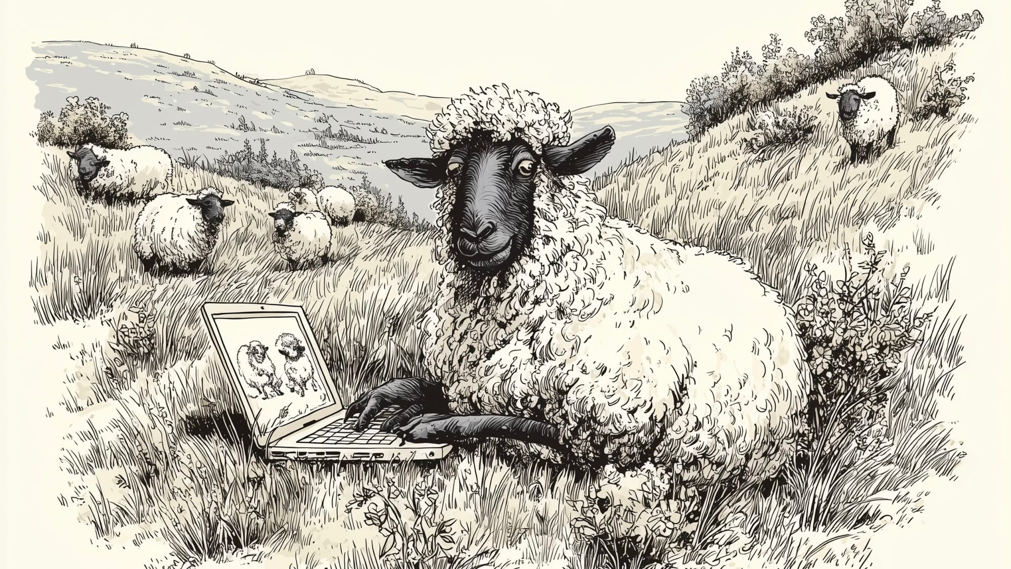 A Scottish Blackface sheep sitting in a grassy hillside field, typing on a laptop that displays cartoon images of other sheep. Drawn in the style of a 1970s British editorial cartoon, with bold ink outlines, cross-hatching, textured shading, muted earth-tone palette, slight exaggeration of features, and gentle satirical tone. Composition 4:3, hand-drawn look, vintage newspaper print texture.