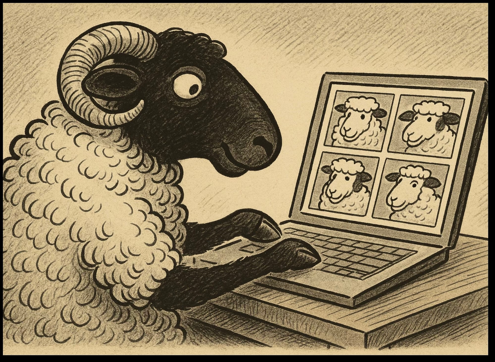 Create a cartoon of a Scottish blackfaced sheep using AI on a laptop to create images of other sheep. Use the visual style of 1970s editorial cartoons, and give it the aspect ratio 4:3